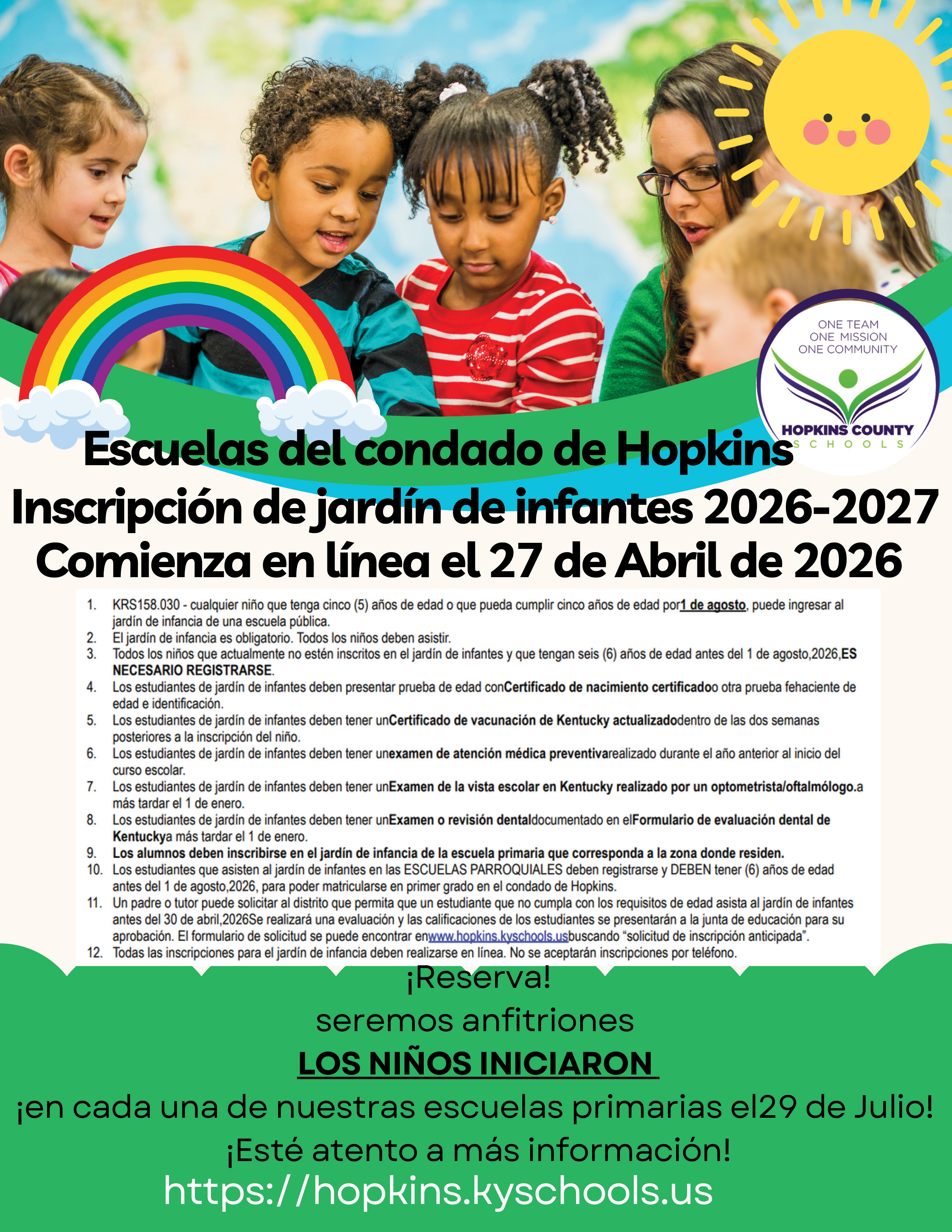 Hopkins County Schools Kindergarten Registration for 2026-2027 begins online on Monday, April 27, 2026. See additional information below.